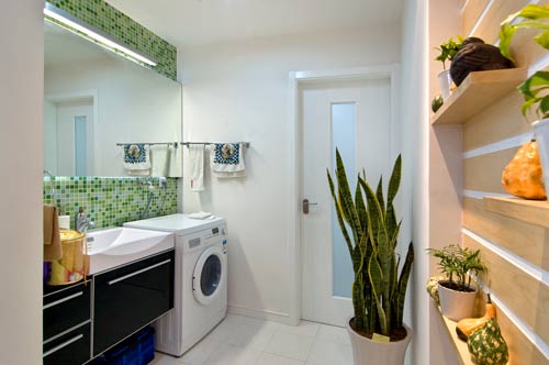 1.從衛浴間出來本是主臥的出口,將主臥的門壘起來后,這又是一個可以利用的空間。設計師將臺盆移出,使用綠色馬賽克裝飾,不但干濕功能區分明顯,也成為一個充滿生機的點綴。