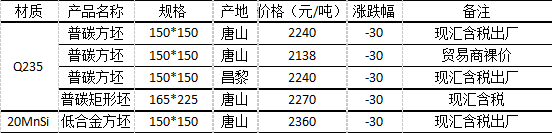 中鋼網唐山訊:周末兩日唐山鋼坯價格累計下跌30元/噸,今晨開盤,當地普碳150坯含稅出廠價2240元/噸,165矩形坯含稅2270元/噸,低合金坯2360元/噸含稅出廠,經銷商裸價2138元/噸左右,昌黎普方坯"target="_blank">方坯出廠含稅價2240元/噸。